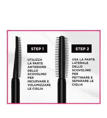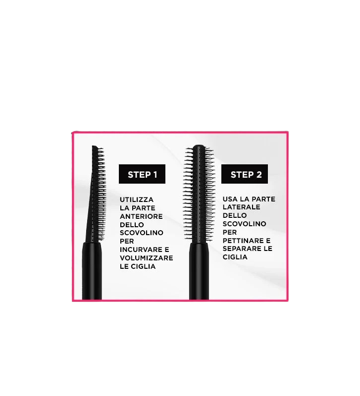 Lo scovolino è realizzato con delle setole a doppio gancio che catturano ogni ciglia dalla radice alla punta, per un effetto lunghezza istantaneo e ciglia separate e incurvate.