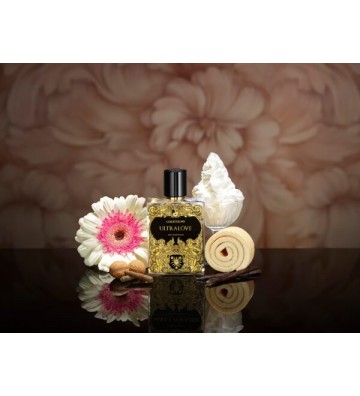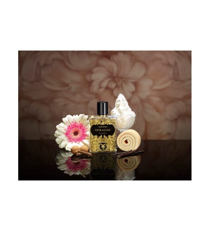 ULTRALOVE si apre con un conturbante inizio che fa chiudere gli occhi portandoci in un sogno: note di nocciola e praline si sciolgono in un caldo aroma di caffè e latte zuccherato, mentre una leggera aria di fragola spinge con tenerezza la fragranza in una fantasia proibita, golosa e avvolgente. La parte floreale entra poi a sostenere il corpo intenso e vaporoso della composizione con note di gelsomino e mughetto che illuminano e nobilitano la dolcezza gourmand delle note di testa. Alla ricerca della ricetta perfetta che bilancia corpo, cuore e anima, la vaniglia si sposa in un matrimonio sensuale e profondo con la fava tonka, il muschio bianco, miele e un caldissimo legno di sandalo. Treemoss e ambra grigia sostengono il terreno dove poggia l’intensità degli accordi dolci e appetitosi delle praline, dando persistenza corposa e una scia potente che sa di un paradiso perduto e finalmente ritrovato in un tenero e sicuro abbraccio d’amore